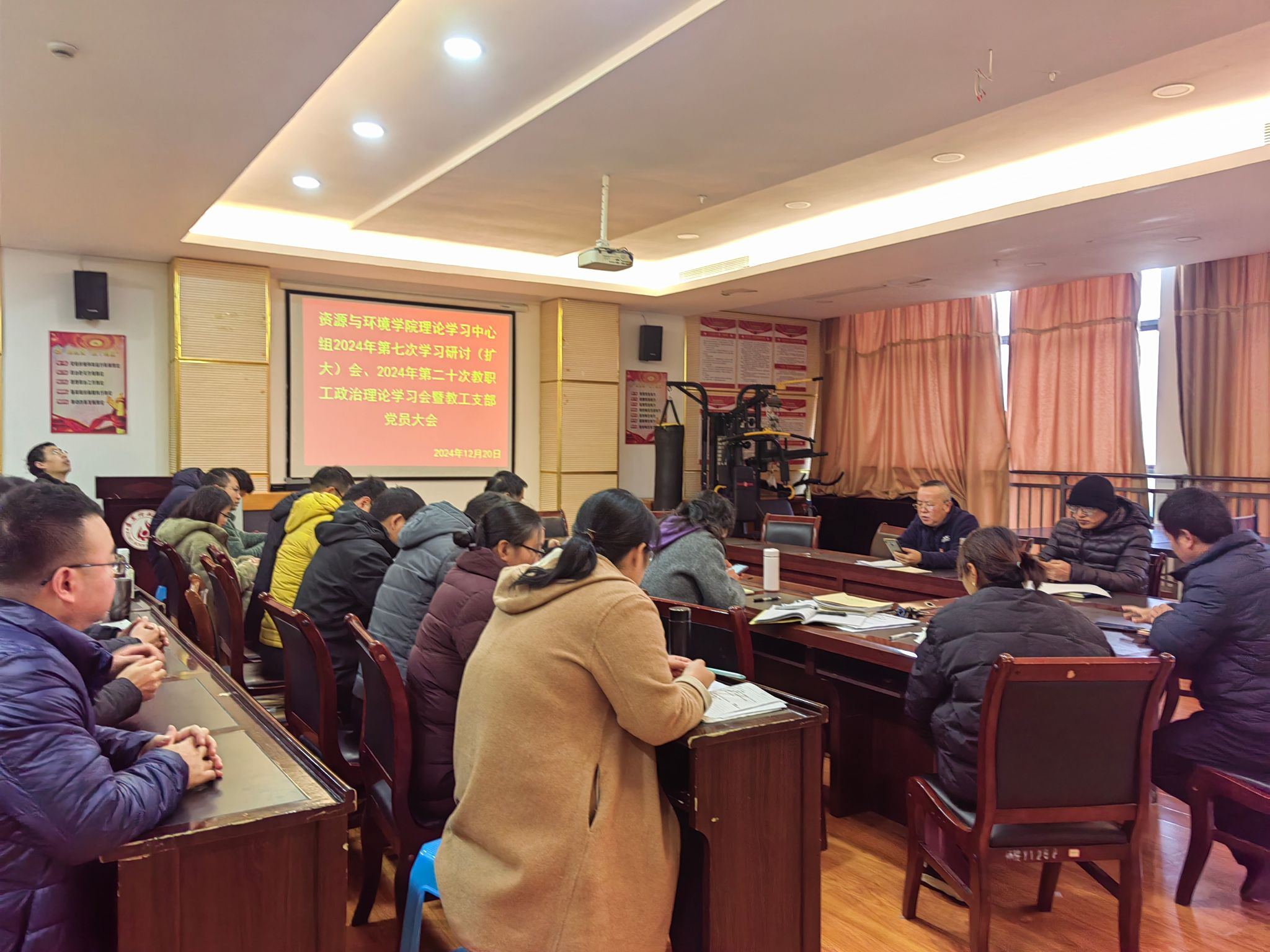 12月20日,资源与环境学院召开理论中心组2024年第七次学习研讨(扩大)会、第二十次教职工政治理论学习会暨教工党支部党员大会。全体党员参会,民主党派及非党员教职工列席,党总支书记张翼主持会议。