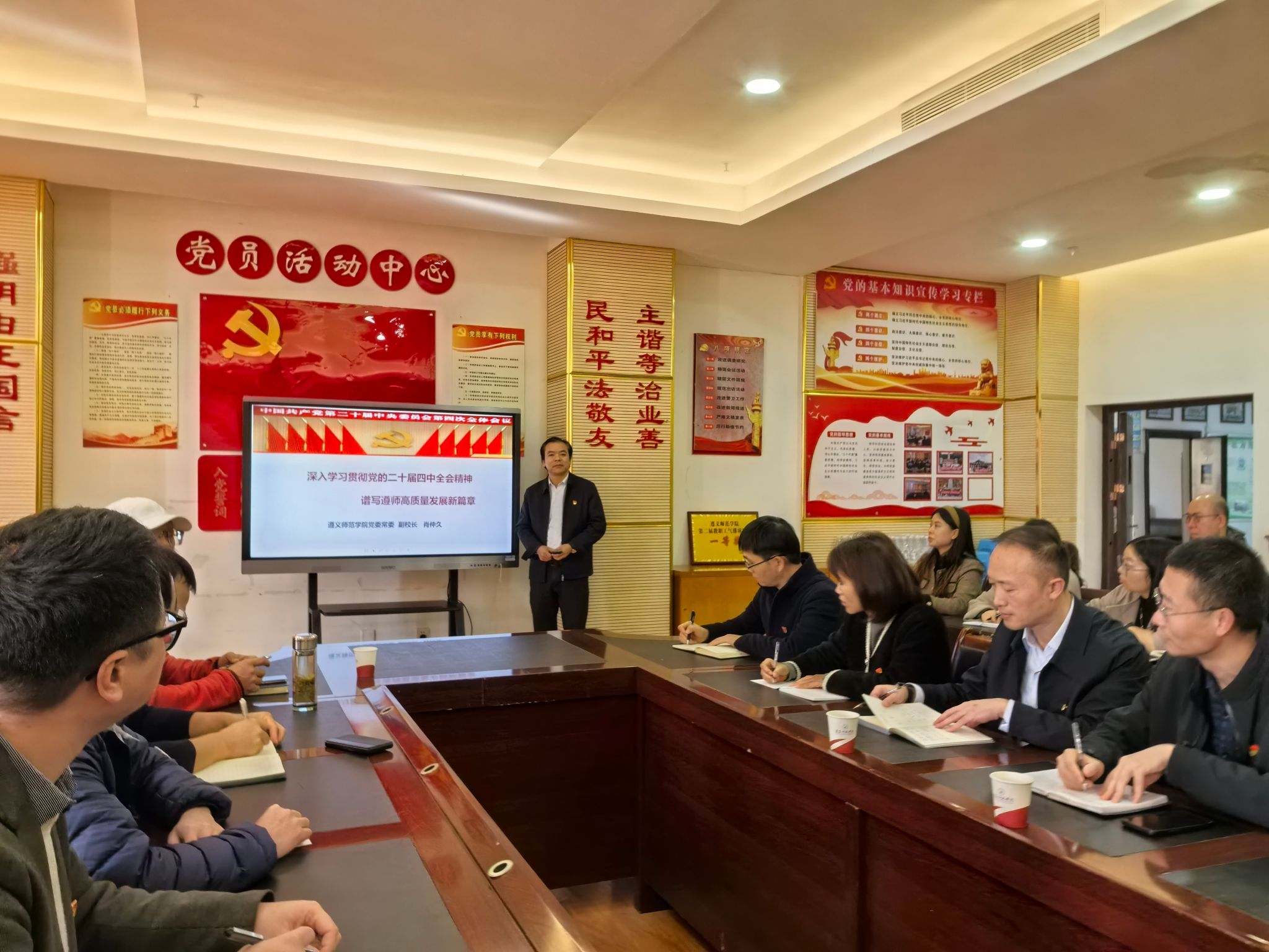 为推动党的二十届四中全会精神在二级学院落地生根,切实把学习成果转化为学院高质量发展的强大动力,11月14日下午,学校党委常委、副校长肖仲久在执理楼106会议室,以《深入学习贯彻党的二十届四中全会精神 谱写遵师高质量发展新篇章》为题作专题宣讲报告。资源与环境学院、数学学院两院党员教师参加宣讲会。
