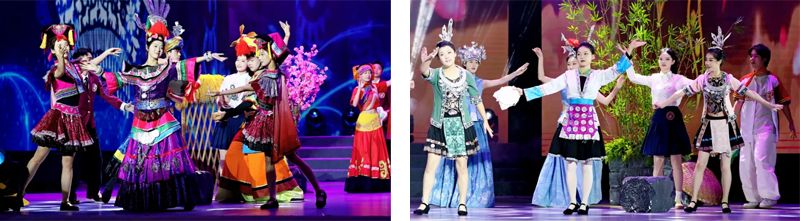 “多彩创意·潮赋新生”全省大学生文化创新设计大赛获奖学校代表的歌舞《山水贵客》以舞姿与歌声展现贵州山水人文之美,舞台布景与表演相得益彰。