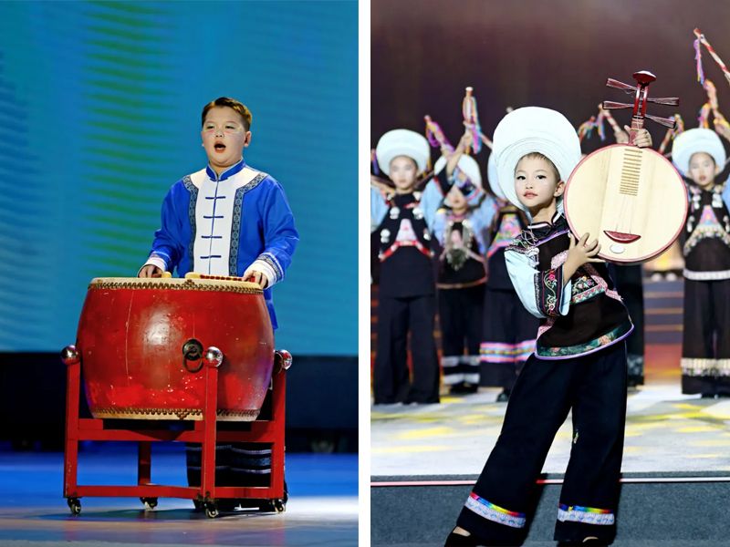 贞丰县第一小学、汇川区重庆路小学学生携手演唱《玉盘》,稚嫩嗓音搭配活泼动作,尽显童真,为活动增添灵动色彩。