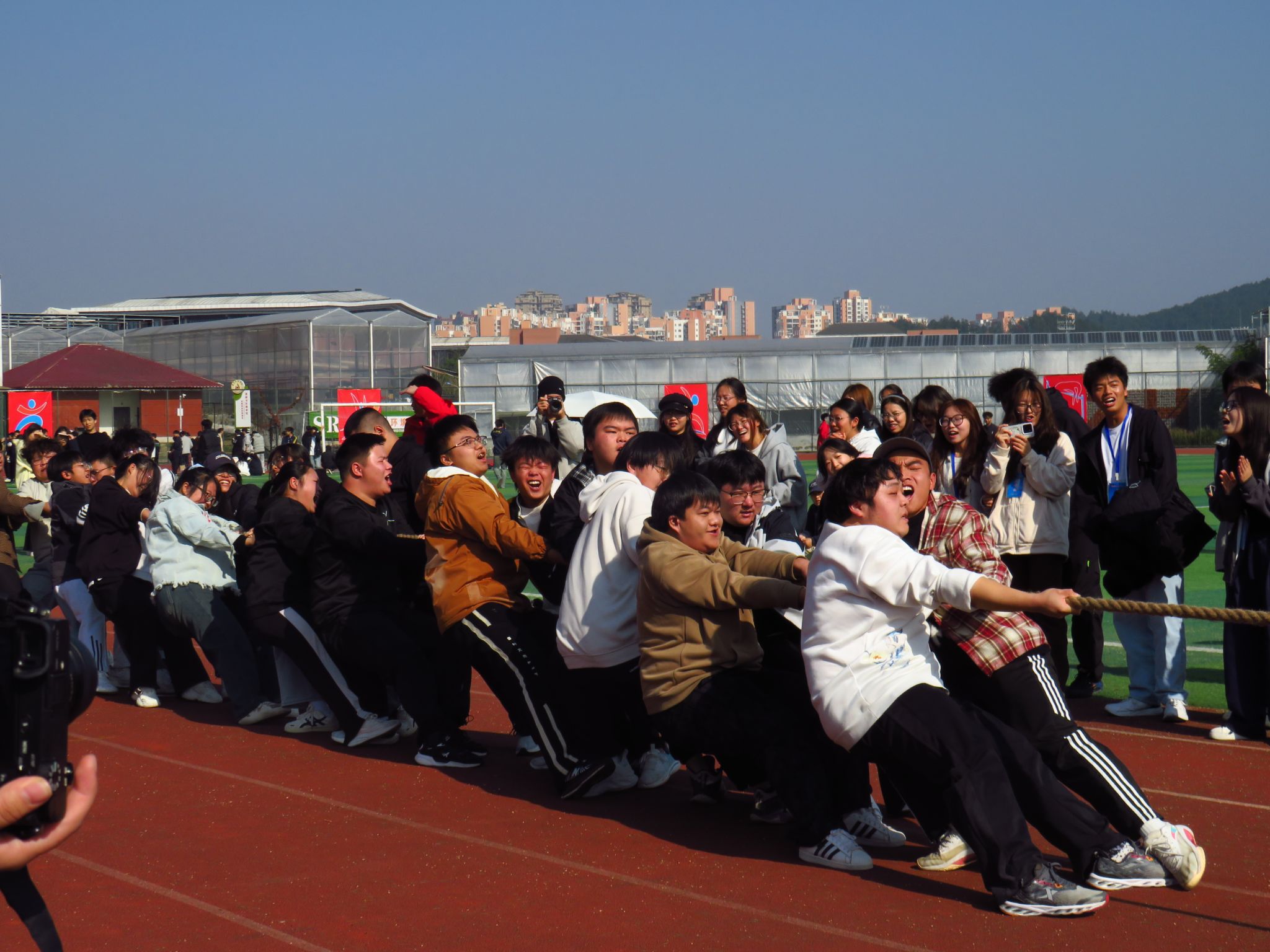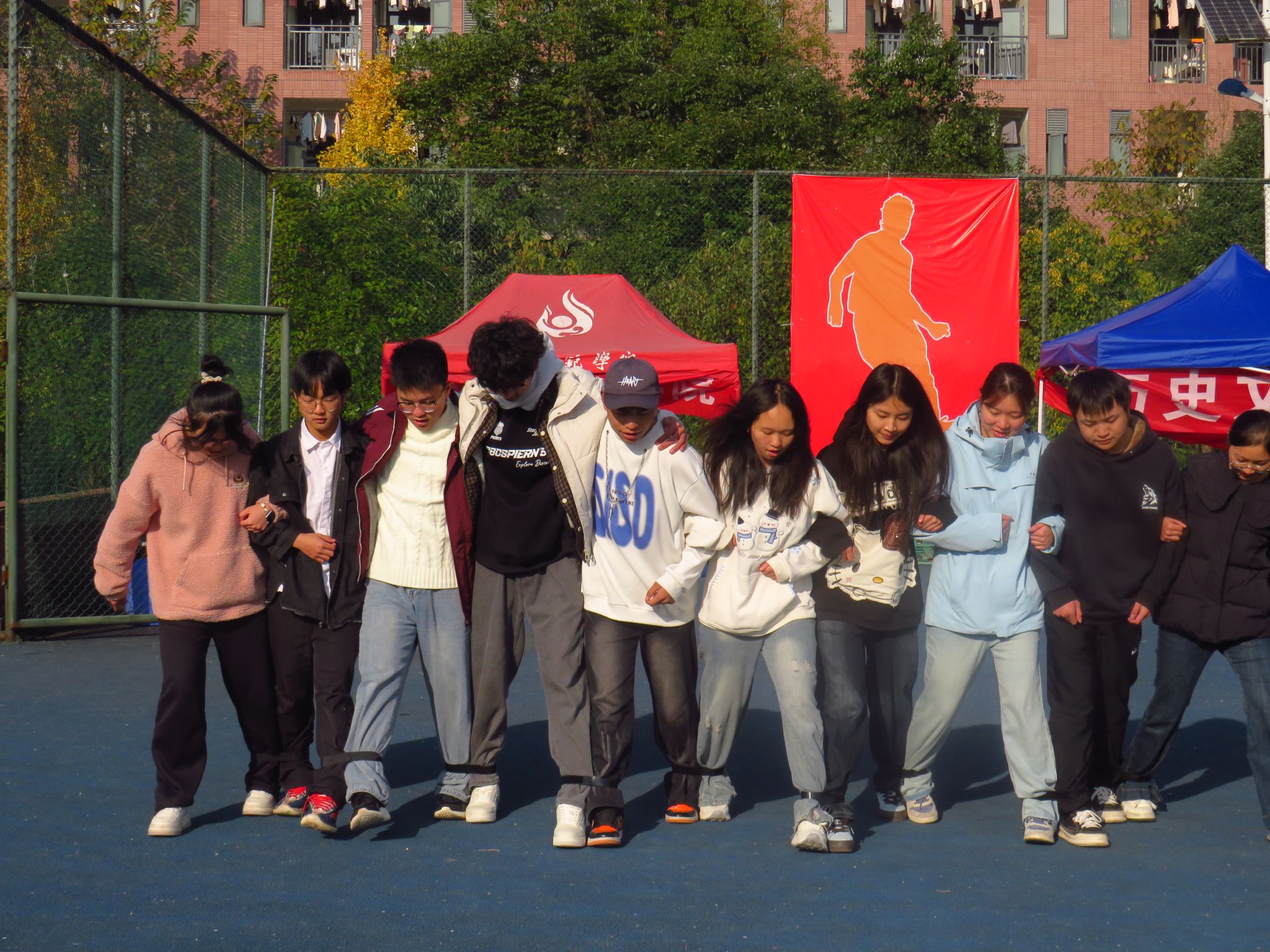 赛场上,化院健儿在各项目中全面发力、屡创佳绩。趣味项目“十人九足”中,队员们脚踝相系、口号铿锵,以整齐步伐挑战速度极限;“50米迎面接力”交接棒之间尽显信任,冲刺瞬间洋溢着青春的张力;拔河比赛中,队员们紧握长绳、齐心协力,呐喊声中迸发出拼搏的激情;投掷沙包、跳长绳等项目亦配合默契,赛场内外加油声此起彼伏。