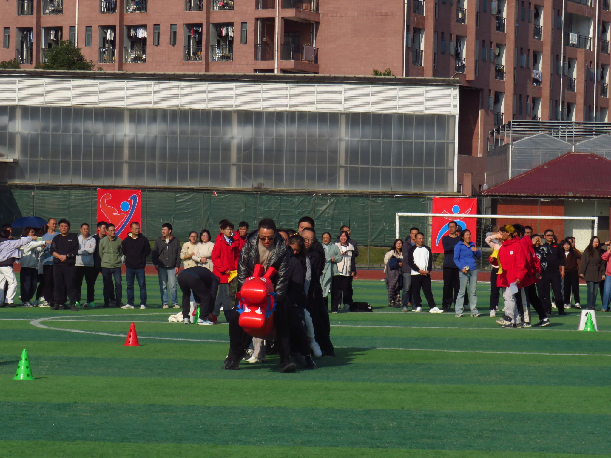 教工组赛事同样亮点纷呈。“同心鼓”项目中,老师们紧盯鼓面,共同控制排球跳跃起落,在不断调整力度与节奏中,展现了高度的协作精神与默契度;“旱地龙舟”赛道上,老师们跨坐“龙舟”、手脚并用,跟随“一二!一二!”的响亮口号稳步疾行,模拟水上劈波斩浪的豪迈姿态,你追我赶间尽显团结奋进的昂扬斗志。
