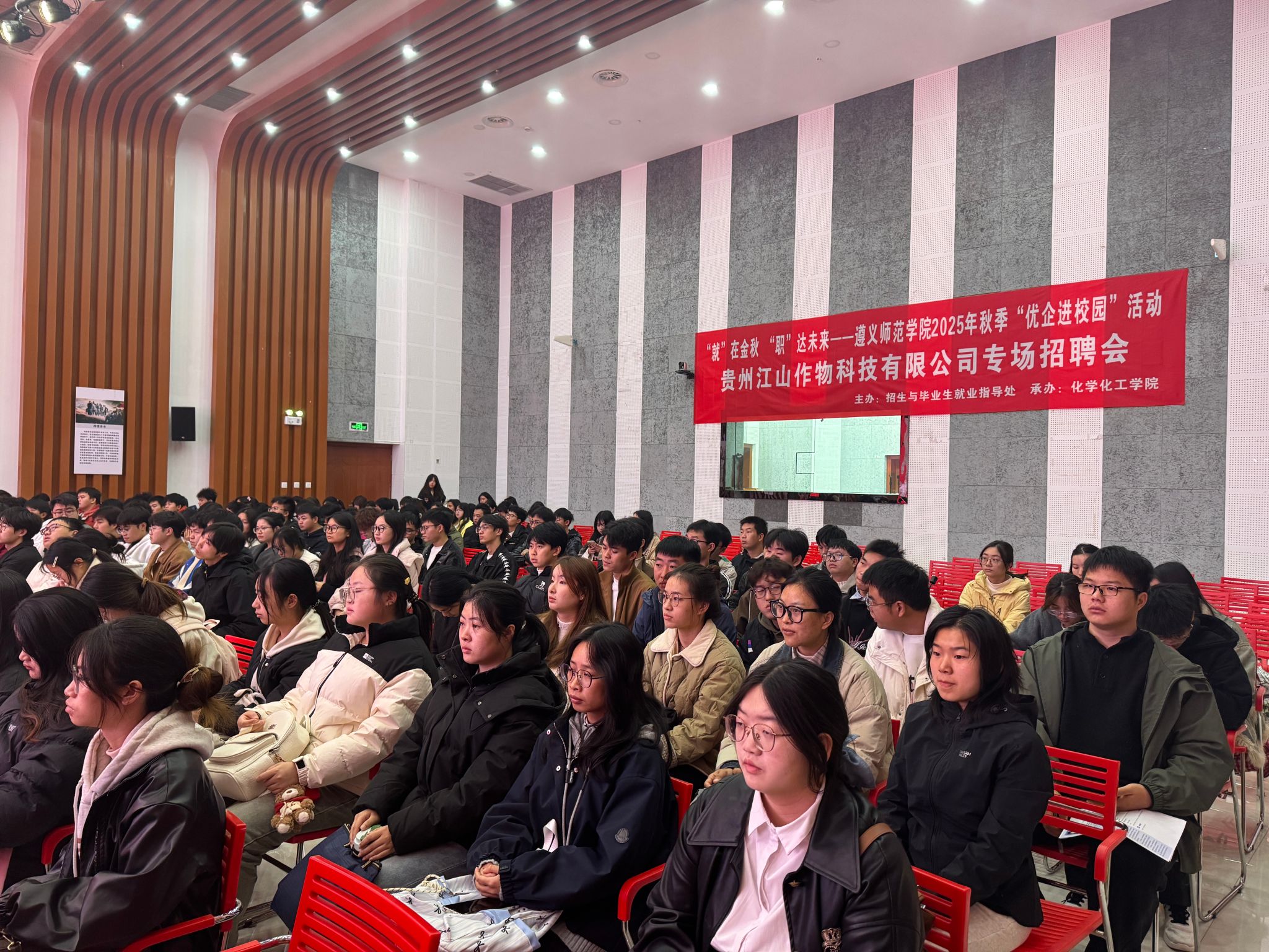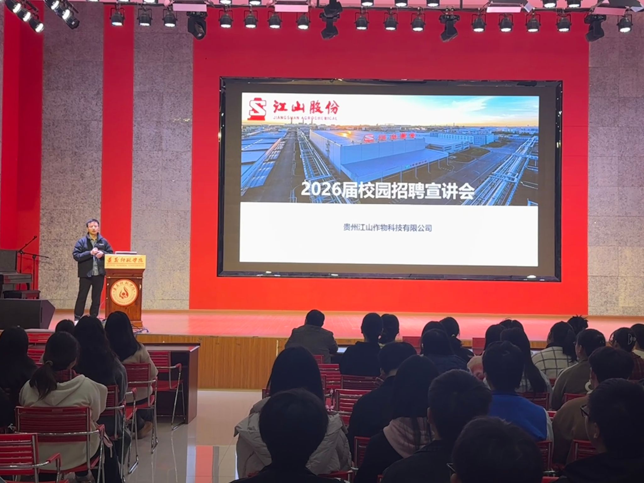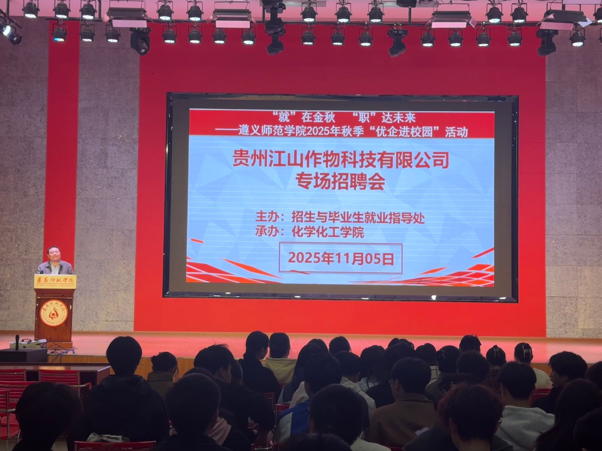 2025年11月5日,由学校招生与就业指导处主办、化学化工学院承办的“‘就’在金秋 ‘职’达未来——遵义师范学院2025年秋季‘优企进校园’活动”贵州江山作物科技有限公司专场招聘会在学生中心长征讲堂成功举办。此次活动不仅为毕业生搭建了优质就业平台,更推动校企双方达成产学研合作共识,实现了“人才输送”与“协同发展” 的双重丰收。
