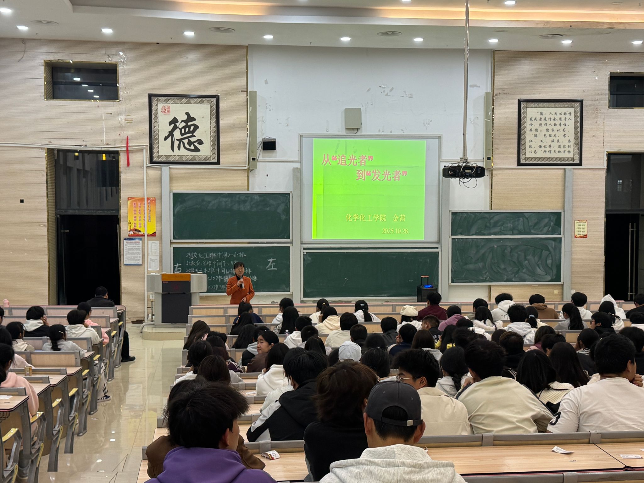 2025年10月28日,化学化工学院在执毓楼107室举办了“从追光者到发光者”为主题的2025级新生职业生涯规划讲座。本次讲座由学院关工委常务副主任、退休教师金茜教授主讲,学院党总支副书记梁兴主持,青年教师代表及2025级全体新生共同参与。