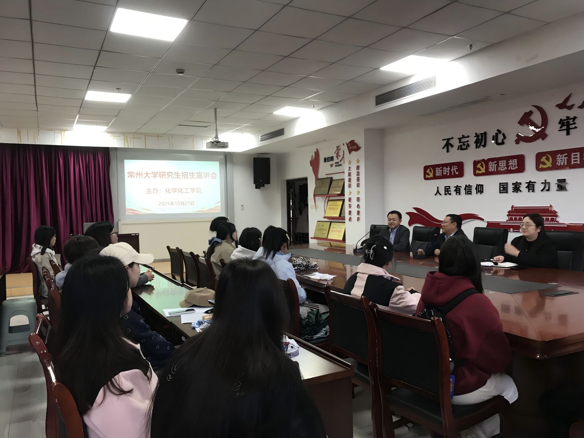 2025年10月21日,化学化工学院在执理楼312室成功举办常州大学研究生招生宣讲会。本次宣讲会特邀常州大学石油与天然气工程学院浮历沛教授担任主讲,学院党总支副书记梁兴主持,吸引了2022级、2023级有考研意向的学生积极参与。