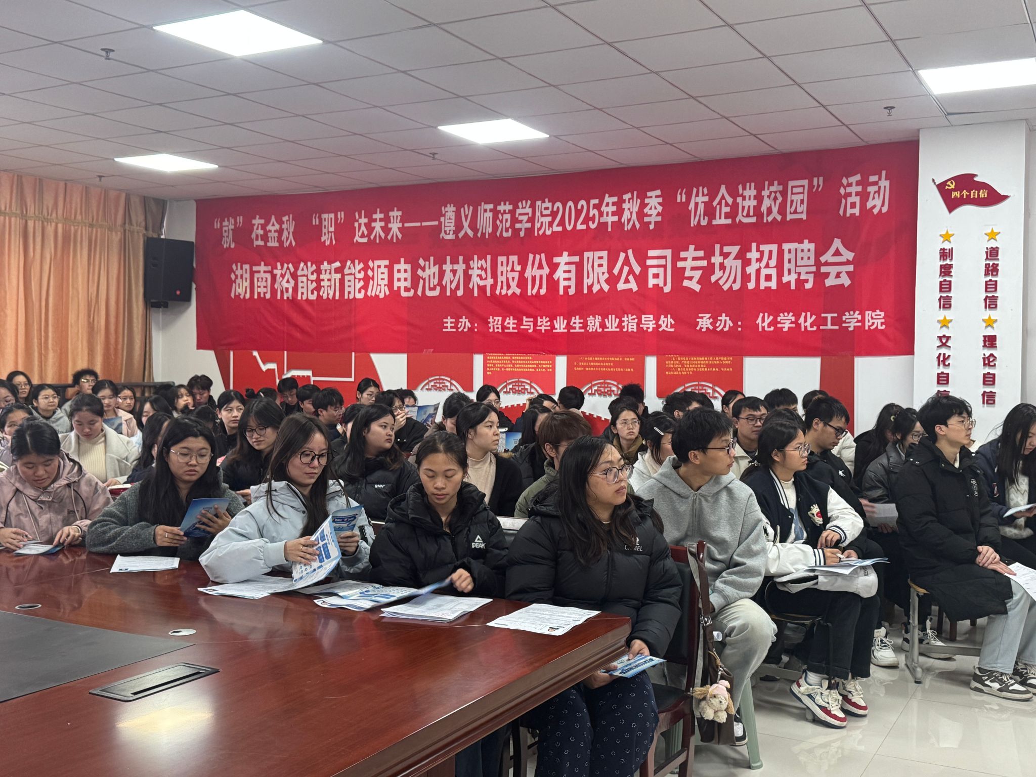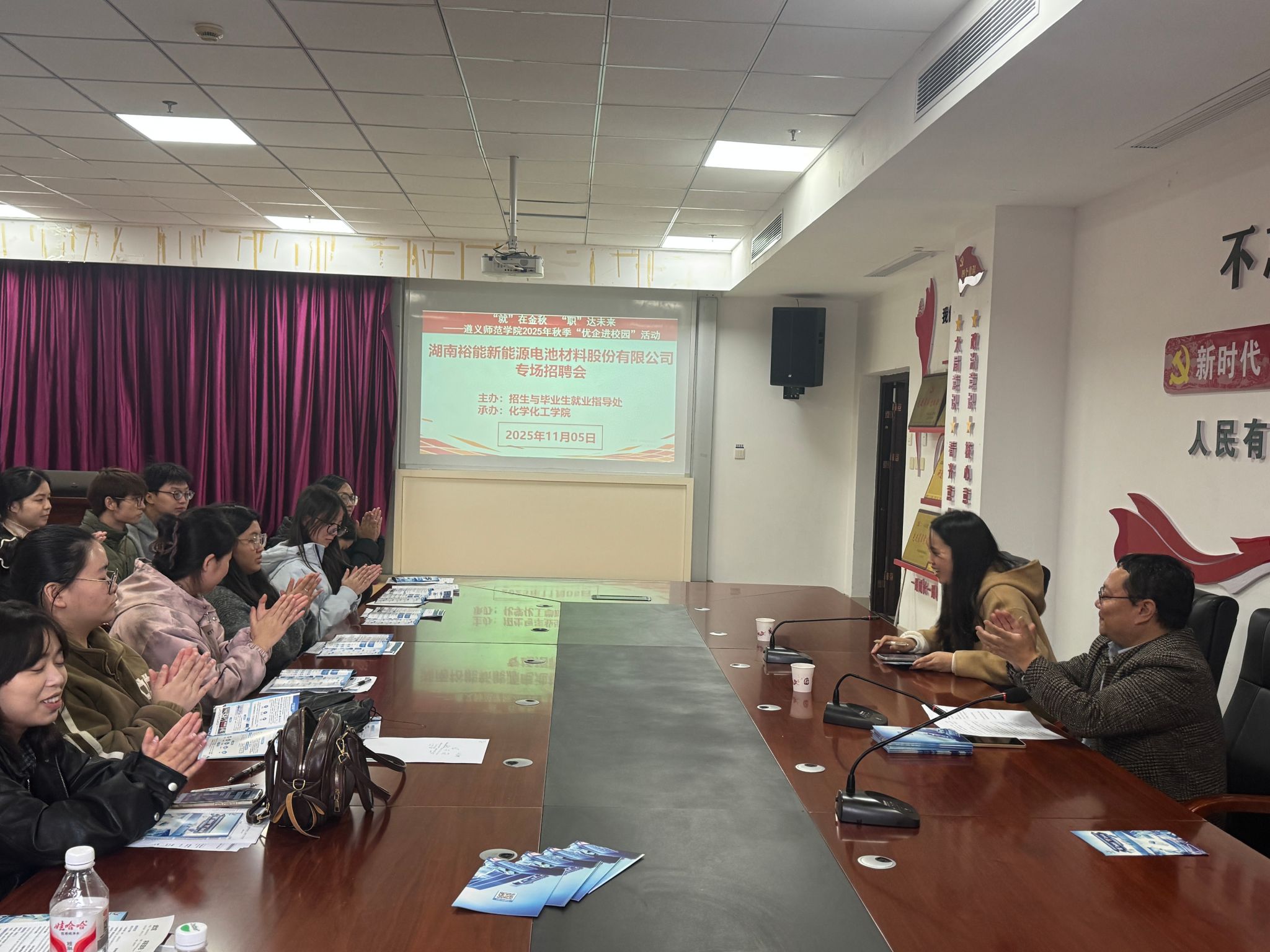2025年11月5日下午,由学校招生与毕业生就业指导处主办、化学化工学院承办的“‘就’在金秋 ‘职’达未来——遵义师范学院2025年秋季‘优企进校园’活动”湖南裕能新能源电池材料股份有限公司专场招聘会在执理楼312室成功举办。本次活动是学校“优企进校园”系列就业促进活动的重要组成部分,旨在推动2026届毕业生更充分、更高质量就业,深化校企协同育人机制。