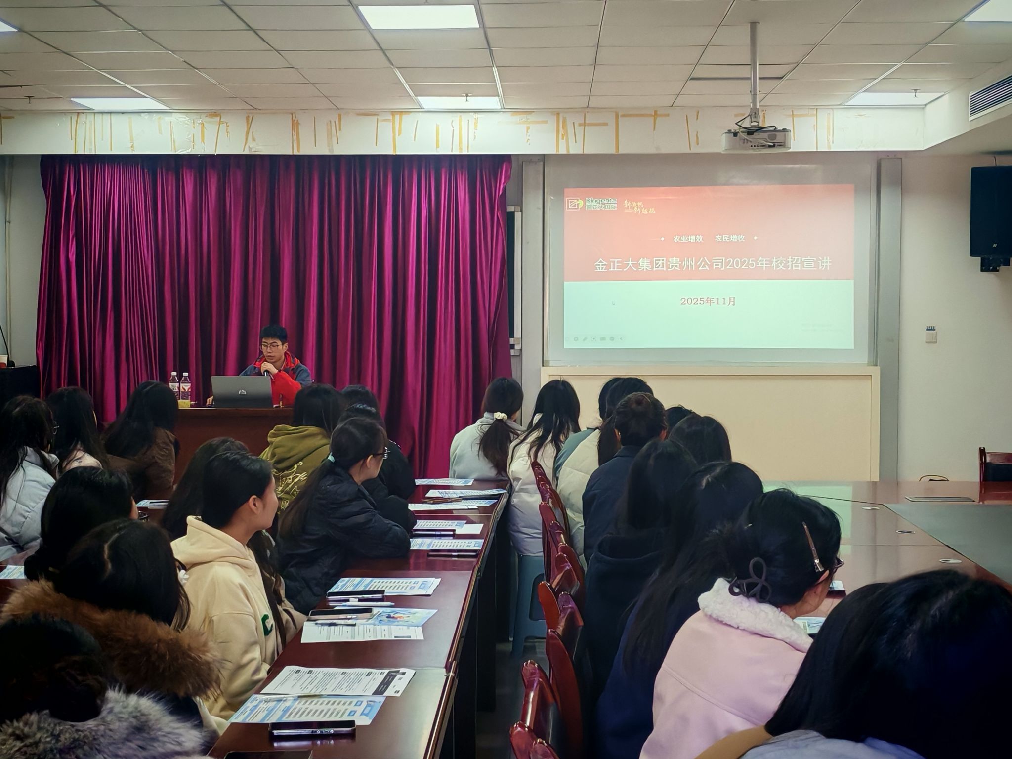 宣讲会上,金正大贵州公司招聘负责人首先向到场学子详细介绍了公司的发展历程——从深耕农业领域多年的行业积淀,到在贵州区域的产业布局与未来规划,再到注重创新与责任的企业文化,让同学们对企业有了全面认知。随后,负责人重点解读了2026届毕业生的招聘岗位需求,涵盖研发、生产、技术支持等多个方向,同时清晰阐述了公司完善的人才培养体系,从新人入职培训到长期职业发展指导,以及具有竞争力的薪酬福利政策,包括五险一金、年度体检、节日福利等,让学子们对求职方向有了更明确的把握。