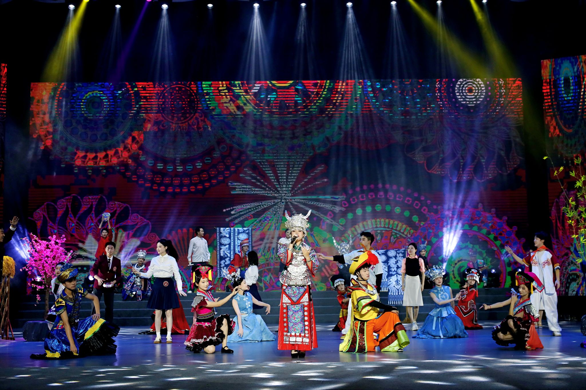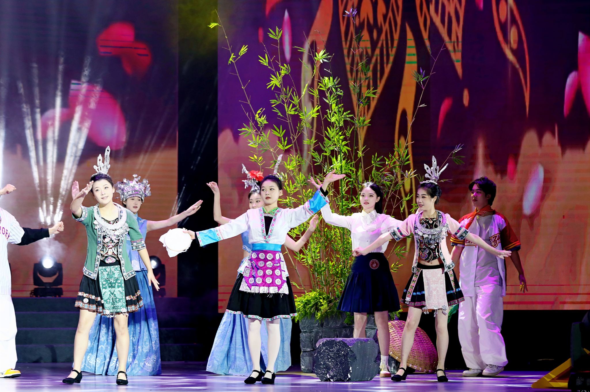 “多彩创意·潮赋新生”全省大学生文化创新设计大赛获奖学校代表的歌舞《山水贵客》以舞姿与歌声展现贵州山水人文之美,舞台布景与表演相得益彰。