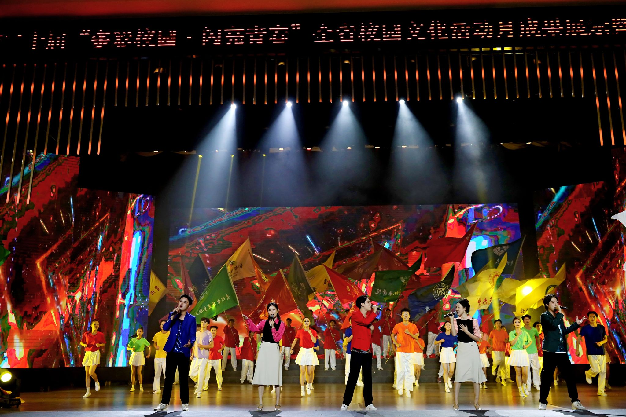 高校代表表演开场歌舞《迎风起跑》后,现场人员通过视频回顾本届校园文化活动月精彩瞬间,了解活动成果,感悟育人初心。