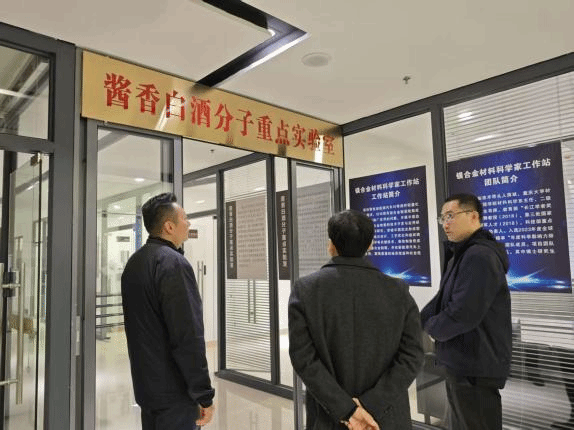 调研组首站来到大学科技园,考察酱香白酒分子重点实验室。科技园负责人张转周详细介绍了实验室基本情况、当前科研进展及下一步规划,基于上千种酱香型酒样检测数据构建白酒分子勾兑大模型。王小波对此表示肯定,强调“将科技成果转化应用于实践是推动产业现代化的关键一步”。