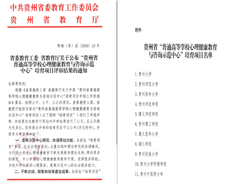 近日,遵义师范学院教师教育学院申报的“贵州省普通高等学校心理健康教育与咨询示范中心”培育项目(以下简称“培育项目”)顺利通过省委教育工委、省教育厅的审批,我校成为贵州省首批心理健康教育培育项目高校。此次培育项目共有近三十所省内高校的心理健康与咨询中心申报,教师教育学院(心理健康与咨询中心)经过申报材料审核、专家现场考察等层层评审环节,顺利成为省内十一家培育项目单位之一。在接下来的工作中,遵义师范学院教师教育学院(心理健康与咨询中心)将继续发挥自身的专业特长,着力服务于学生培养工作,积极服务地方社会经济发展,带动更多的高校、中小学推动心理健康教育工作的开展。