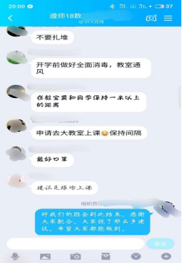 互联网并没有切断情感的联络,各班同学在云端见面心情格外激动,亲切问候,互相鼓励。相信经过此次云班会,同学们会更加重视疫情防控,坚定抗击疫情的信心。同时也会自觉居家不外出,认真上好线上直播课,积极配合学校做好各种信息的收集工作,为战胜新冠肺炎疫情做出自己的贡献。