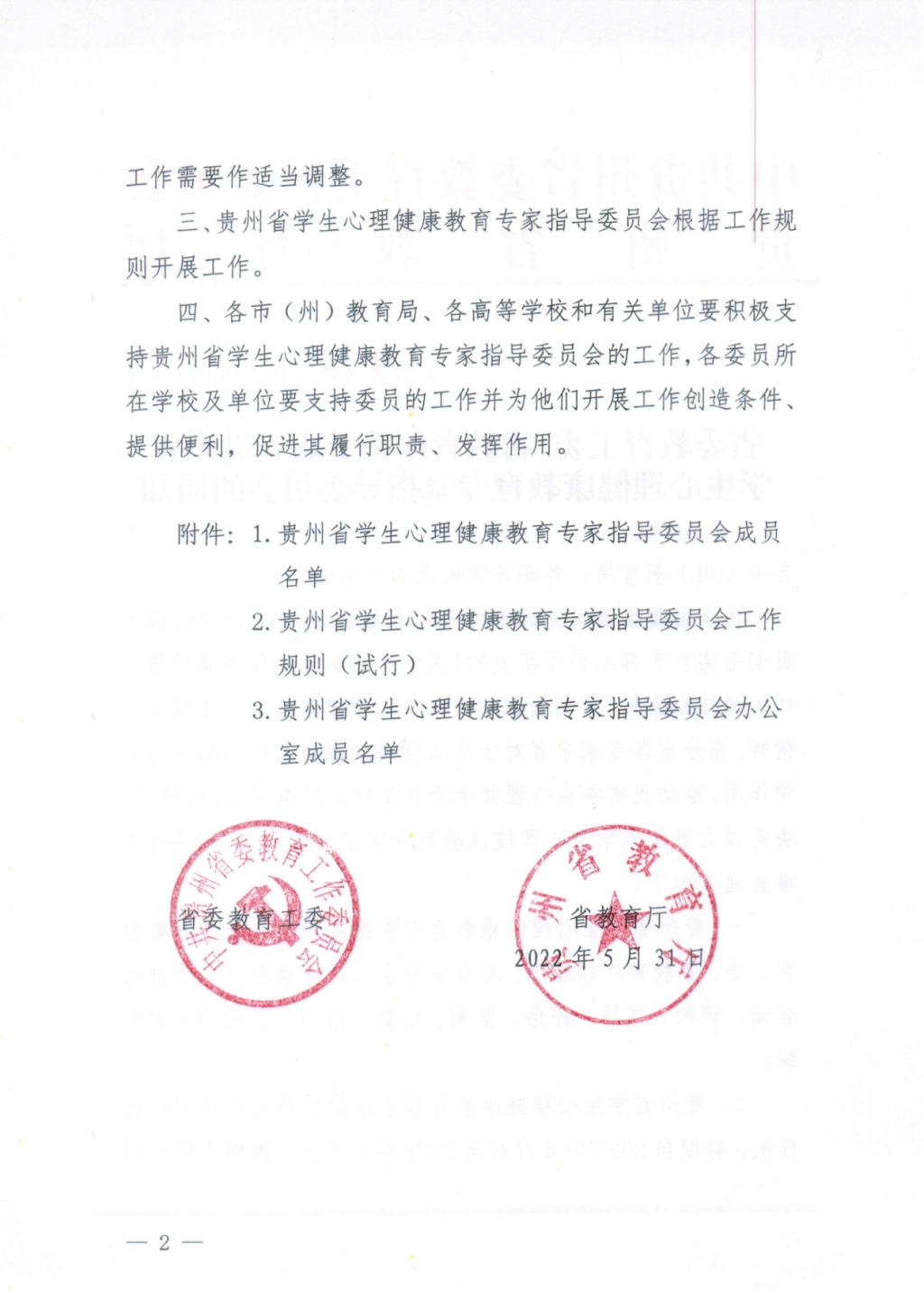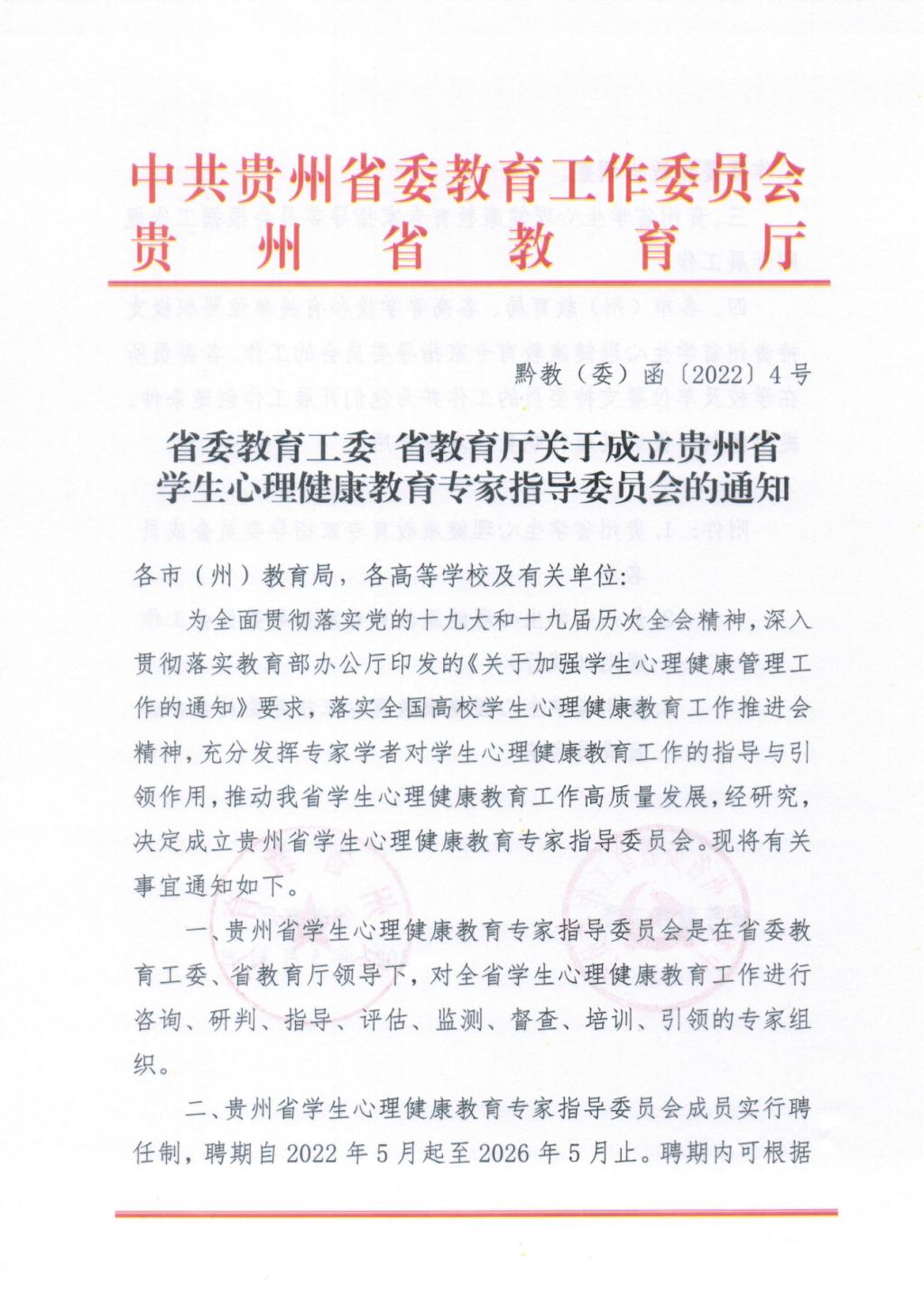 贵州省学生心理健康教育专家指导委员会是贵州省委教育工委、贵州省教育厅领导下的专家组织,接受贵州省委教育工委、贵州省教育厅的领导,对全省大中小学学生心理健康教育工作进行指导、咨询、督查和评估等。