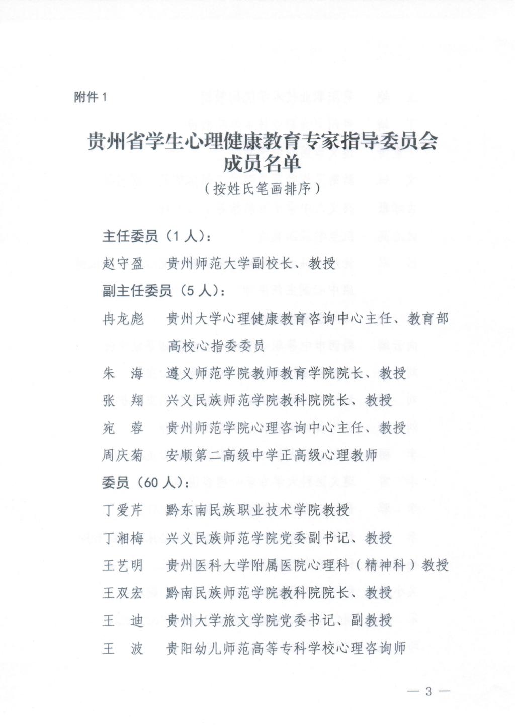 经贵州省委教育工委、贵州省教育厅评选,我校推荐的朱海教授、周云教授成功入选为贵州省学生心理健康教育专家指导委员会委员。其中朱海教授为贵州省学生心理健康教育专家指导委员会副主任委员,周云教授为贵州省学生心理健康教育专家指导委员会委员。