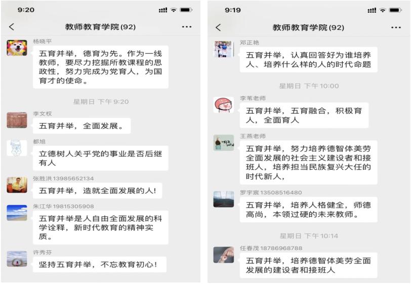 本期节目通过5个独立而又融合的篇章,为广大师生家长讲述了一段发生在贵州大地上的“五育”之美,助力引导学生树德、增智、强体、育美、爱劳。观看结束后,老师们反响强烈,纷纷在微信群交流心得。杨晓平老师说:“五育并举,德育为先。作为一线教师,要尽力挖掘所教课程的思政性,努力完成为党育人,为国育才的使命。”朱春芳老师也表示:“提高人文与科学素养,使自己成为身心灵健康、和谐、快乐的人,促进学生健康、快乐、可持续的发展。”