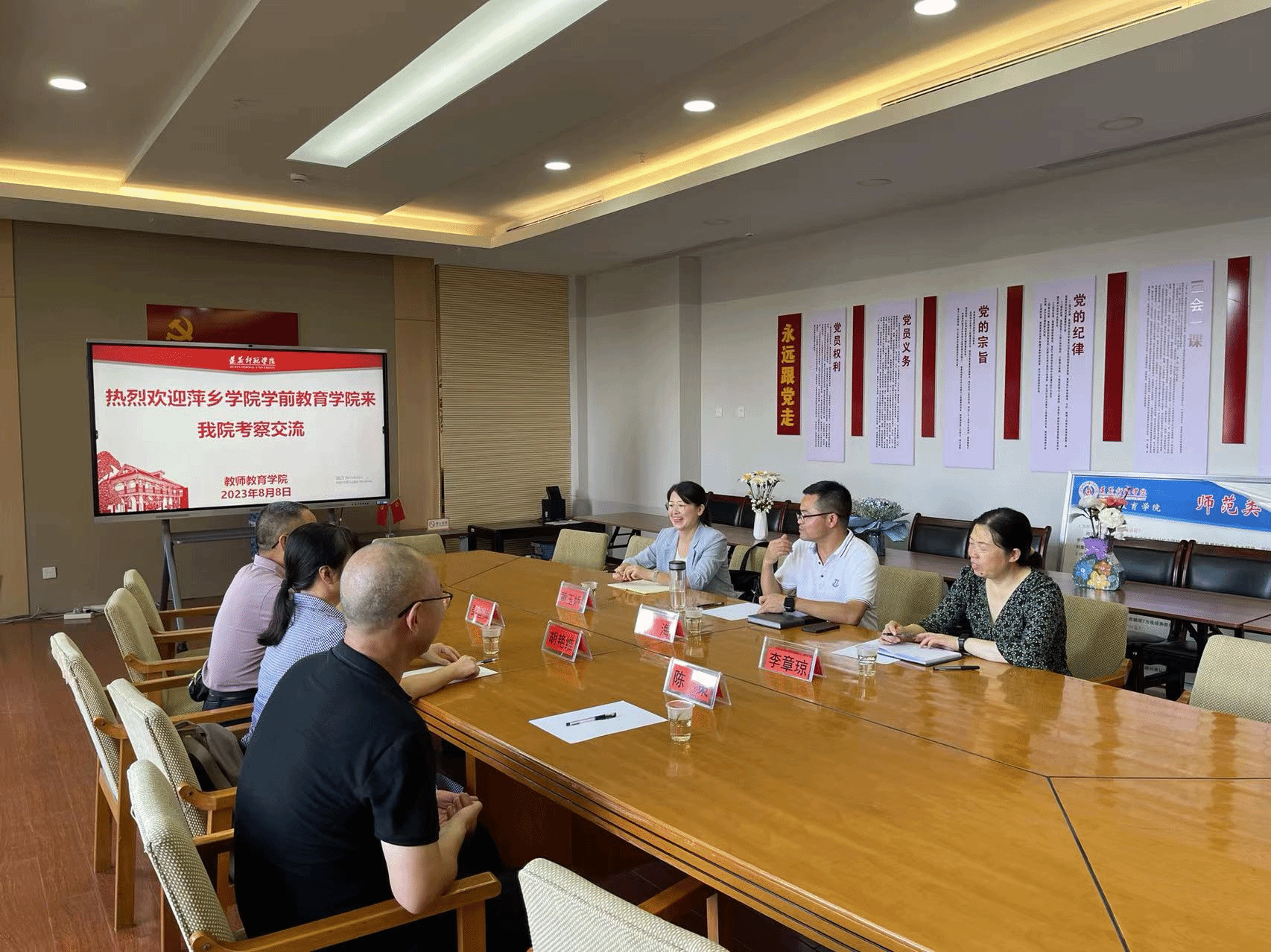 2023年8月8日下午,萍乡学院学前教育学院院长胡艳维、副院长彭香萍、教授陈策一行来我院考察交流。教师教育学院院长朱海、副院长李章琼、学前教育教研室主任黄玉娇参加了本次座谈交流。