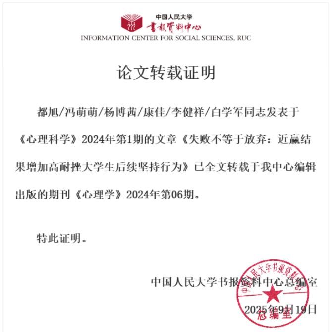 我院教师都旭博士撰写的《失败不等于放弃:近赢结果增加高耐挫大学生后续坚持行为》一文被人大复印资料《心理学》全文转载。文章原刊发在《心理科学》(CSSCI来源期刊)。
