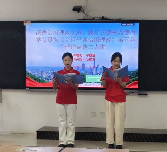 2025年10月21日,教师教育学院以“深悟治国理政之道,践行立德树人使命”为主题,开展了《习近平谈治国理政》第五卷“理论宣传二人讲”宣讲活动。宣讲以“讲理论+讲实践”双轨模式,将治国理政思想与学校育人实践深度融合,为全校师生呈现了一场兼具思想高度与实践温度的理论盛宴。宣讲人为邓睿涵同学和马银兰同学,2024级各班级积极参与。