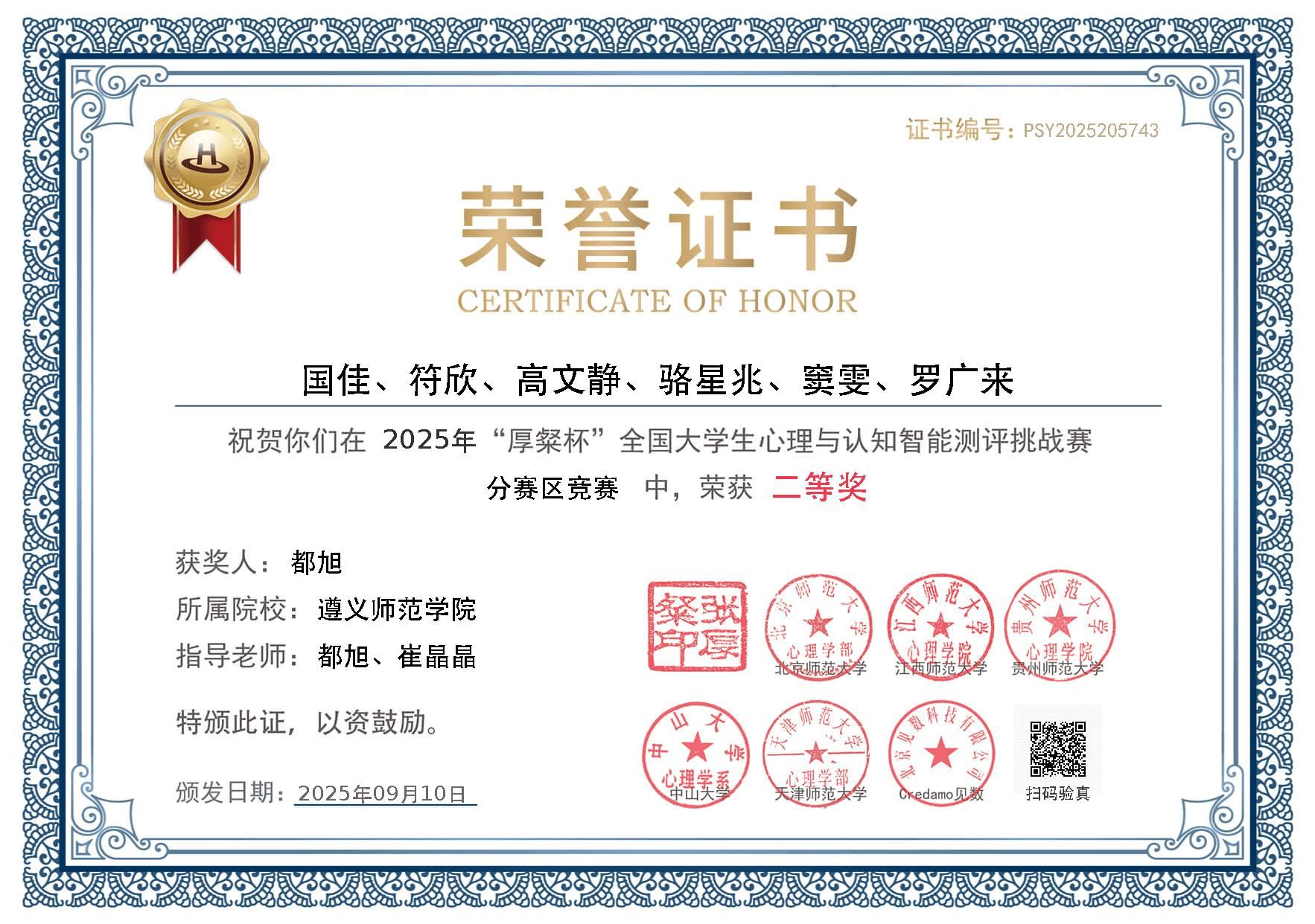 近日,由全国大学生心理测量赛事联盟主办、北京师范大学等单位承办的2025年“厚粲杯”全国大学生心理与认知智能测评挑战赛正在如火如荼的开展中。全国共有1194个队伍参加比赛。我院都旭博士、崔晶晶博士带领2023级、2024级应用心理学本科生组成3支参赛队伍,在校赛、分区赛、全国总决赛中陆续斩获佳绩,包括校赛二等奖1项、三等奖2项,西部赛区(含重庆、四川、贵州、云南、陕西、甘肃、青海、宁夏、新疆、西藏)分区赛二等奖1项,全国总决赛优秀奖1项。