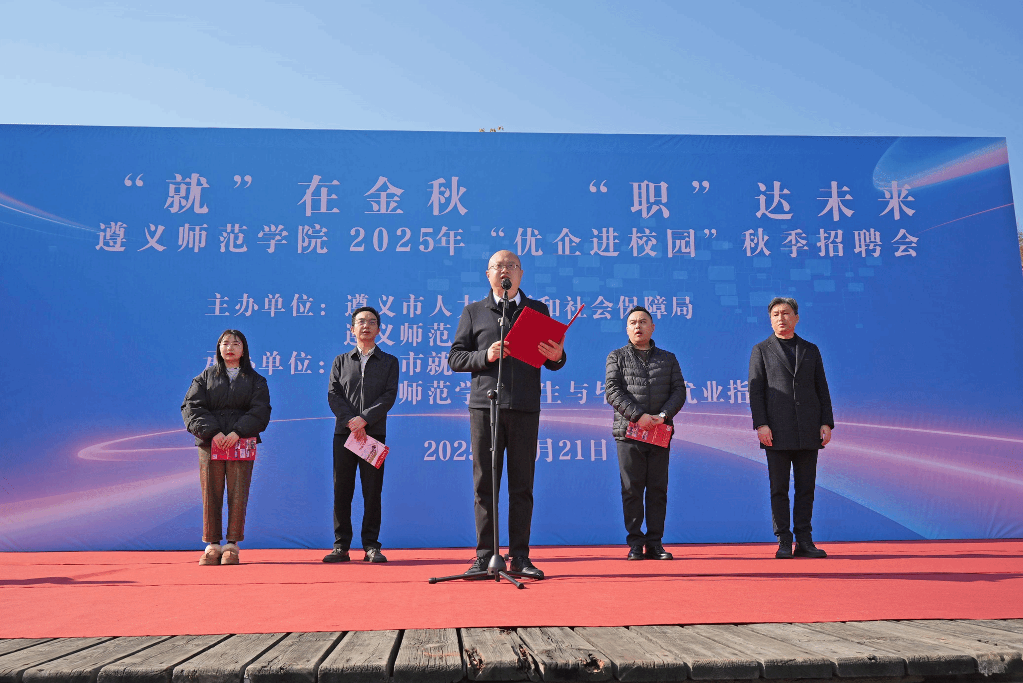 遵义师范学院党委副书记周晶出席活动并致辞。周晶强调,学校始终将就业工作摆在高质量发展的核心位置,不断深化和推进“毕业生高质量就业”系统工程;鼓励毕业生把个人理想融入企业发展和社会需求中,在未来的职业生涯中,坚持发扬“忠诚、坚韧、担当”的遵师红心青年优良传统,并表示学校将永远是遵师学子最坚实的后盾。