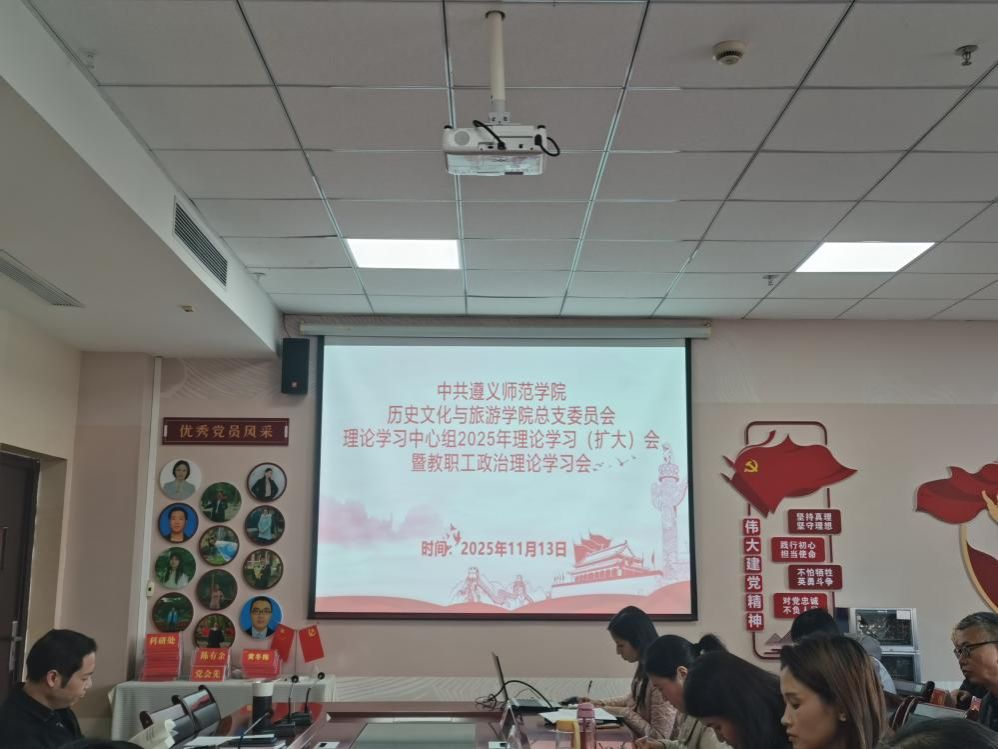 2025年11月13日14:00,历史文化与旅游学院党总支理论学习中心组在执文楼323会议室召开了2025年第十三次理论学习(扩大)会议暨教职工第十二次政治理论学习会议,本次会议由院长郗玉松主持,参会人员为全院教职工。