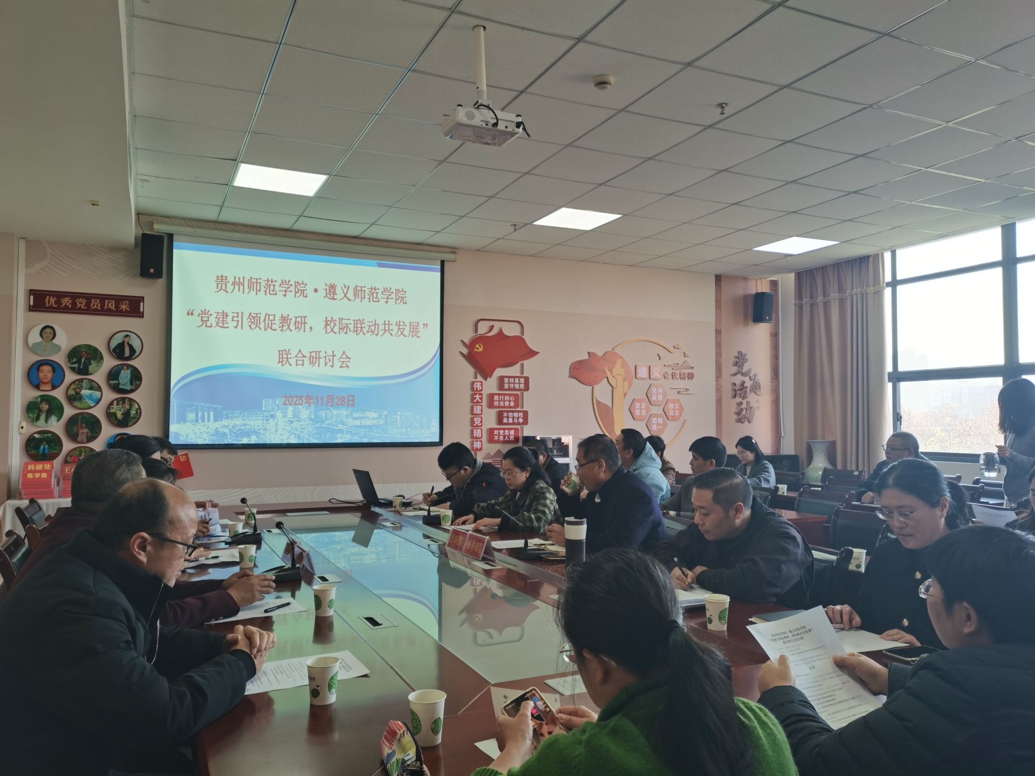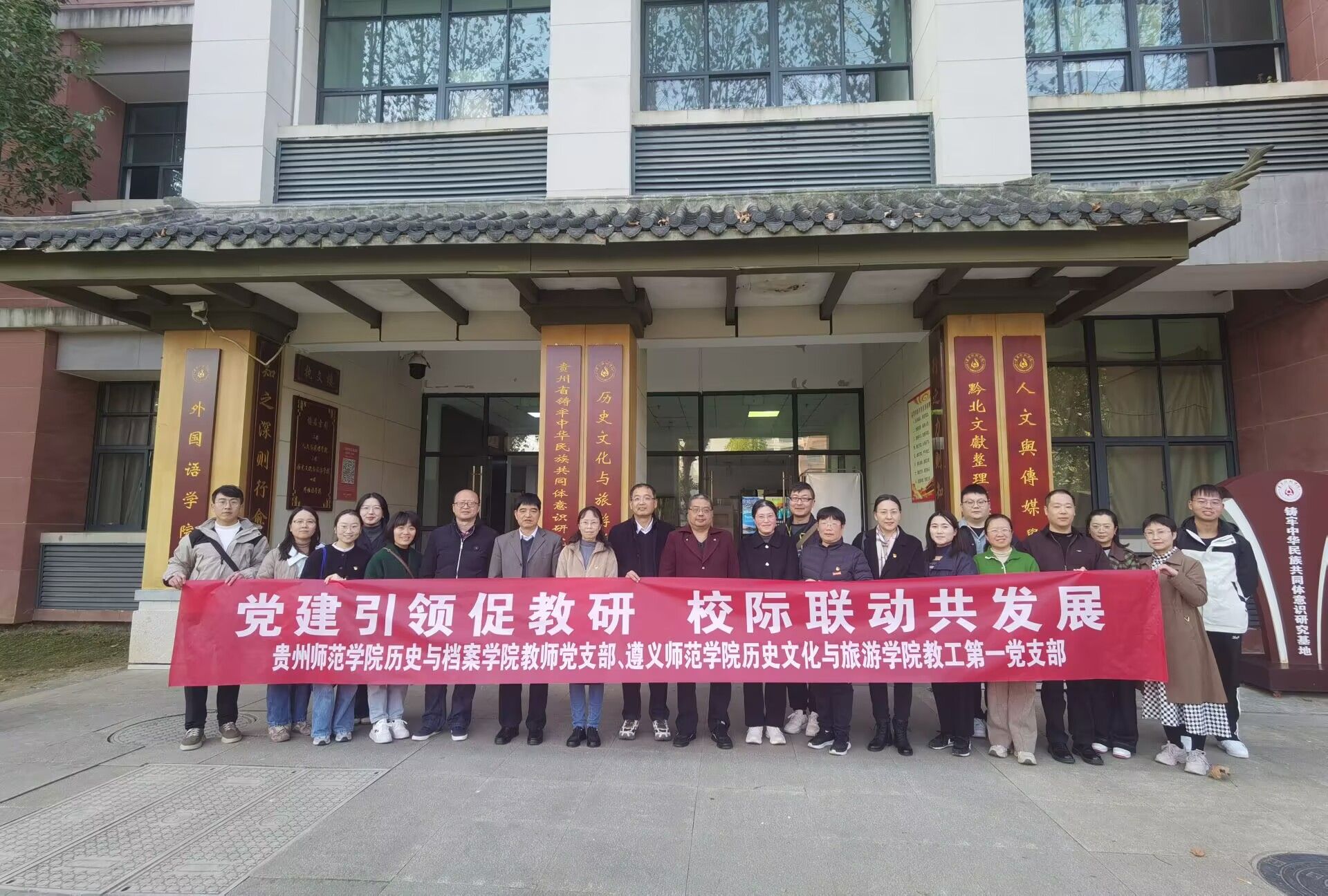 为深入贯彻落实新时代党的建设总要求,以高质量党建引领教育事业高质量发展,深化校际交流与合作,2025年11月28日下午15时,贵州师范学院历史与档案学院与遵义师范学院历史文化与旅游学院“党建引领促教研,校际联动共发展”联合研讨会议在遵义师范学院执文楼323会议室举行。两院相关领导、基层党组织负责人、学科带头人及教师代表30余人齐聚一堂,共商党建与教研深度融合之计,共绘院际协同发展蓝图。