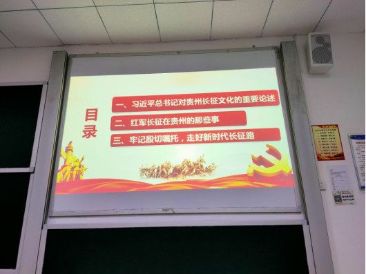 党课内容分为三个部分:第一部分“习近平总书记对贵州长征文化的重要论述”,深刻阐述了以遵义为主要代表的贵州在长征文化的重要贡献,长征文化与遵义精神在贵州建设发展中起到的巨大作用。第二部分“红军长征在贵州的那些事”,一个个经典故事从胡教授口中绘声绘色地传出,让我院师生仿佛置身于八十多年前那个伟大的时段,对贵州长征也有了进一步认识。第三部分“牢记殷切嘱托,走好新时代长征路”,号召师生明确时代重任,不忘初心,砥砺前行。