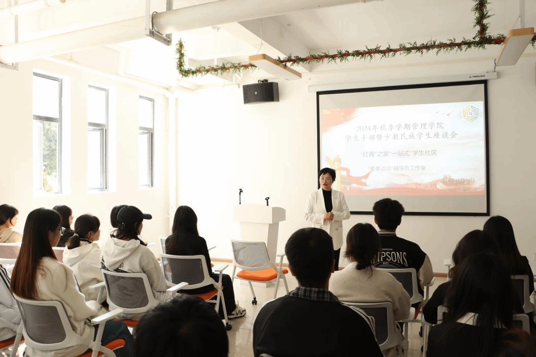 2024 年 10 月 31 日12:40,管理学院在“红青”之家“一站式”学生社区星耀园召开学生干部暨少数民族学生座谈会。此次会以由管理学院学生科科长、美美谈谈辅导员工作室成员李华琴主持召开。管理学院团总支、学生会、宣传中心各部门主要负责人,各班团支部书记、班长以及少数民族学生代表参加了此次会议。