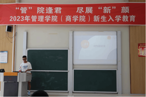 为引导新生进一步适应大学生活,选择适合自己的学生组织,全方位历练个人本领。2023年9月16日管理学院(商学院)在执治楼112报告厅举行2023年新生入学教育之团学介绍讲座,指导教师张坤美及2023级各班,2021级物流本科(1)班全体学生参加,讲座由学院学生各组织主要负责人主讲。