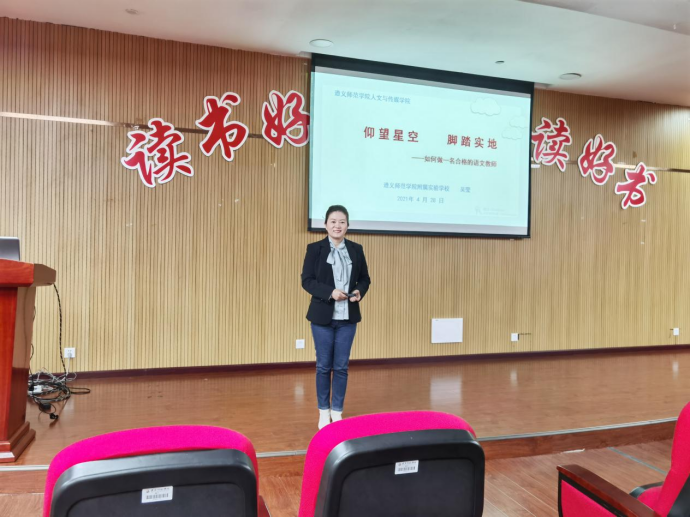 2021年4月28日下午两点,“仰望星空,脚踏实地”主题讲座于图书馆102教室顺利开展。此次活动由遵师附校吴莹老师主讲,19级中文班全体同学积极参加。