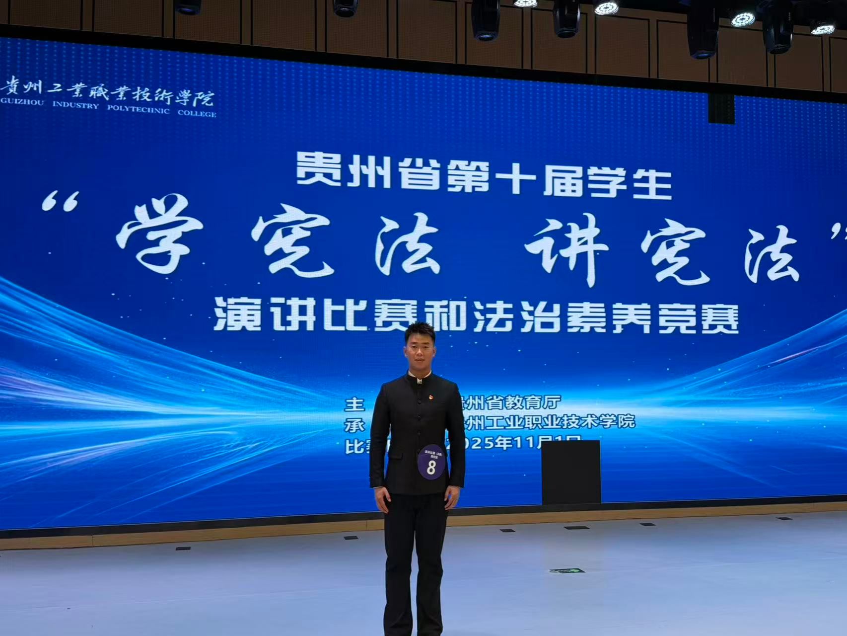 本届大赛由贵州省教育厅主办,于贵州工业职业技术学院举行,汇聚了全省各高校的优秀学子同台竞技。在题为《宪法精神与青年担当》的演讲中,朱兆麟同学以一名未来传媒人的视角,深刻阐述了宪法作为国家根本大法的至高权威与时代价值。他巧妙地将专业所学与宪法实践相结合,以饱满的情感、流畅的表达和缜密的逻辑,援引经典案例,生动诠释了宪法在治国理政中的基石作用及其与青年成长的密切关联。其富有思想性与感染力的演讲内容,以及沉稳大气的舞台风采,赢得了评委们的高度认可。