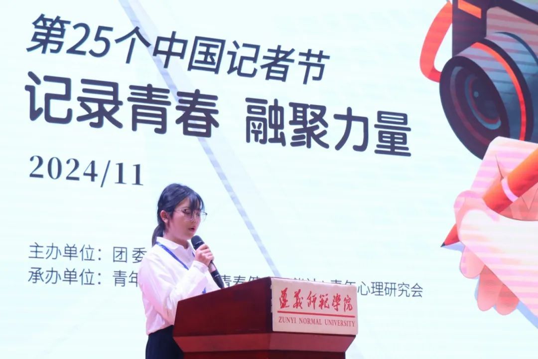 为深入学习习近平总书记对宣传思想文化工作作出的重要指示精神,引导学生记者坚定信心、同心同德、奋力前行,在第25个中国记者节来临之际,我校团委在长征讲堂组织开展“记录青春·融聚力量”拓展活动。遵义市新闻传媒中心视频直播部制片人匡斌,团委文体部副主任、青年媒体中心指导教师敖正雅,青年媒体中心全体学生记者、各学生组织宣传干部共80余人参加。活动由青年媒体中心副总编郑全杰主持。