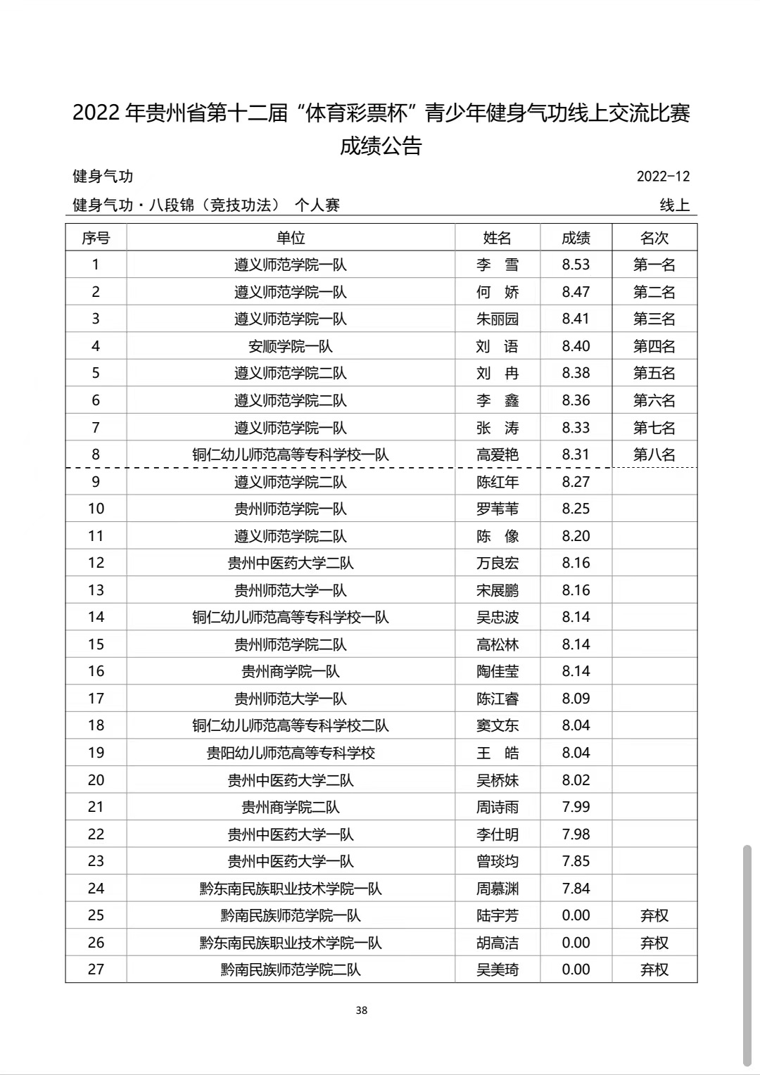 2022年11月遵义师范学院体育学院派出两队队员参加由贵州省体育局,贵州省教育厅主办,贵州省健身气功协会,贵州省社会体育管理中心承办的贵州省第十二届青少年健身气功线上交流比赛,我校由曹云和种松两位老师担任教练员以及八名同学参加了比赛,本次比赛与以往不同的是采用线上比赛的形式,共有来自全省近70只队伍。在短短几天的时间内,在教练员的指导和队员们默契配合下,经过前期训练和赛前集训,八名运动员(何娇、李雪、朱丽园、张涛、陈红年、刘冉、李鑫、陈像)分别获得八段锦(竞技功法)集体赛第一名、第二名;八段锦(普及功法)集体赛分别获得第一名、第六名;八段锦(竞技功法)个人赛李雪、何娇、朱丽园斩获前三,刘冉、李鑫、张涛分获第五至第七名;八段锦(普及功法)个人赛李雪获得第一名,朱丽园获得第四名,何娇获得第七名。