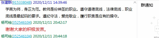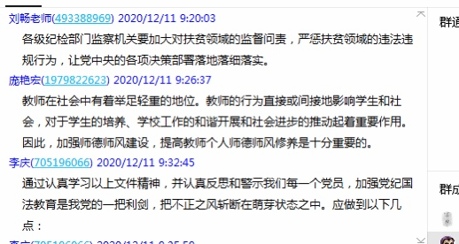 为深入推进反腐倡廉教育,加强外国语学院党总支教工第一支部党员思想道德建设,提高其政治思想水平,2020年12月10日晚7:30,外国语学院教工一支部在QQ群平台上举行“警示教育”学习活动,会议由杨司桂书记主持,主持人首先把警示教育的相关内容上传到QQ群上,要求本支部党员先认真阅读,之后进行讨论。