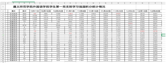 目前,外国语学院学生第一党支部38名党员同志均已进入“学习强国”平台展开自主学习,党员积分与日俱增,绝大多数党员能够坚持学习,起到了很好的模范带头作用。截至12月20日,根据数据统计显示,最高积分为郑冬雪同志4614分、其次为李龙彩同志4429分,且从10月份起,本支部党员积分均呈现递增。