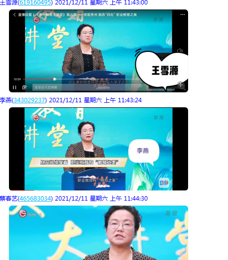 2021年12月10日晚上21:45,外国语学院组织全体老师观看学习“贵州教育大讲堂”第8期专题片《技能贵州服务“四化”----职业教育之美》。本次专题片通过电视台和新媒体同步播出,贵州广播电视台科教健康频道(6频道)、动静APP教育板块动静APP直播板块、动静贵州微信公众号、动静贵州视频号、贵州教育大讲堂抖音号(62627002718)、贵州教育发布微信公众号、贵州教育发布抖音号(2002104792)同步推送。外院老师用手机或电脑聆听了本期张静教授为我们带来的讲座,全院老师将观看的截图发在群内。