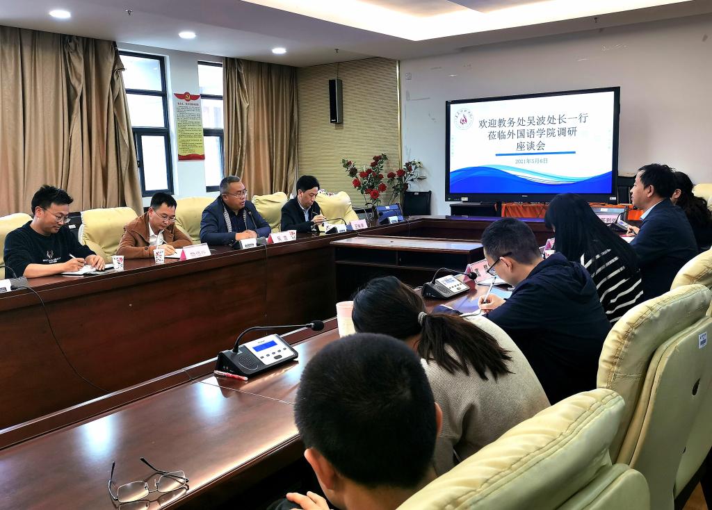 2021年5月6日下午,学校教务处吴波处长一行到外国语学院进行调研座谈,座谈会在执文楼415会议室举行。外国语学院院长张建群,副院长高翼,副院长赵宏维,全体教学科老师参加了此次座谈会。