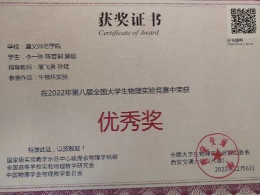 她积极参加各类竞赛活动,包括院级、校级、省级和国家级各项活动比赛,其中,院级和校级比赛包括有遵义师范学院团支部“微团课”竞赛、物理与电子科学学院主题演讲比赛、物理与电子科学学院红色故事讲解员比赛等,这些比赛为她在今后参加省级和国家级比赛打下了坚实的基础。在第六届全国大学生天文创新作品竞赛和贵州省第四届大学生物理学术竞赛等比赛中,她成绩优异,曾获2023年物理与电子科学学院“五四”表彰优秀先进个人和素质拓展先进个人、遵义师范学院第十六届田径运动会优秀运动员和先进个人、第八届全国大学生物理实验竞赛优秀奖、贵州省第四届大学生物理学术竞赛三等奖、贵州省第十八届挑战杯竞赛红色专项活动类三等奖、遵义师范学院大学生物理创新竞赛科普组一等奖、第九届中国国际互联网+创新创业大赛校赛铜奖等。