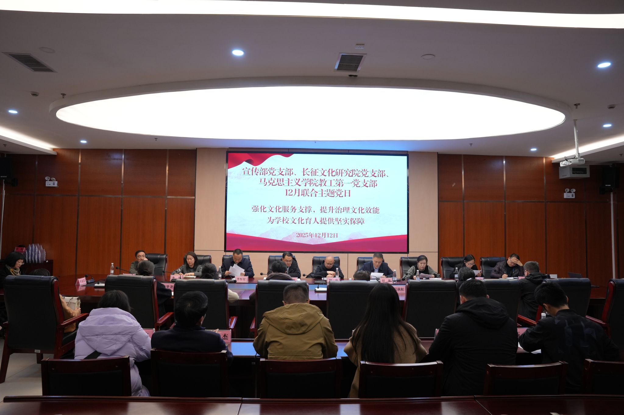 本网讯(文/施宣 图/余建成)12月12日,宣传部党支部联合长征文化研究院党支部和马克思主义学院教工第一党支部在学术交流中心一号会议室开展联合主题党日活动。围绕2025年党员基本培训第三次集中大课进行交流研讨。宣传部党支部书记付强主持。