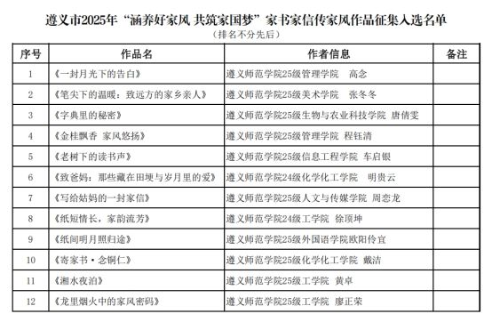 近日,由遵义市妇女联合会与遵义师范学院联合举办的2025年“家书家信传家风”主题宣传活动征集阶段圆满结束,备受期待的优秀作品入选名单正式公布。