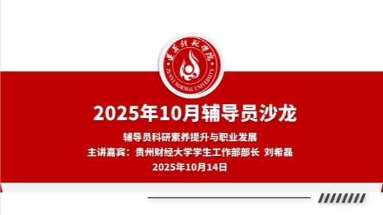 为切实提升我校辅导员队伍的科研能力和专业素养,推动学生工作理论与实践深度融合,2025年10月14日,学校在行政楼321会议室成功举办了以“辅导员科研素养提升与职业发展”为主题的辅导员沙龙。本次活动特邀贵州财经大学学生工作部刘希磊部长担任主讲嘉宾,学校党委副书记周晶出席活动,党委学生工作部部长吴廷强主持,全体辅导员参加了本次学习交流。