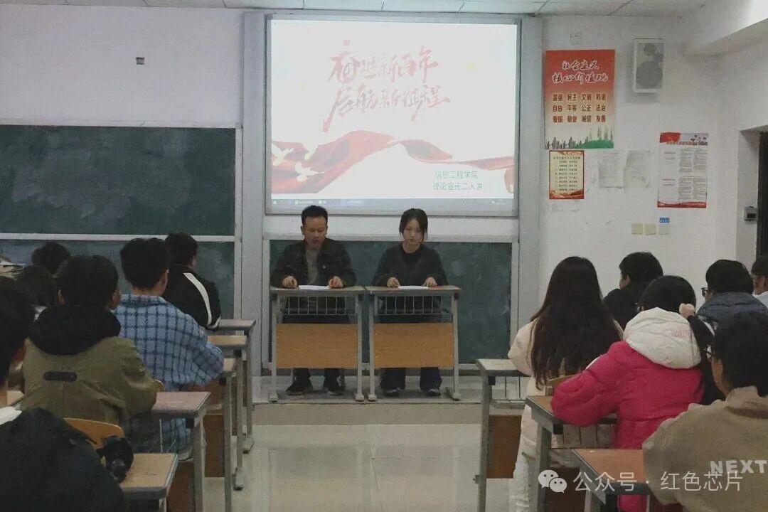 为引导师生深刻把握习近平新时代中国特色社会主义思想的理论精髓,筑牢思想根基。2025年10月31日,信息工程学院于执矩楼332举办“理论宣传二人讲”活动。本次宣讲由周文达、洪妤璇主讲,两位宣讲人分别聚焦理论与实践,解读《习近平谈治国理政》第五卷的核心要义与学校实践路径。