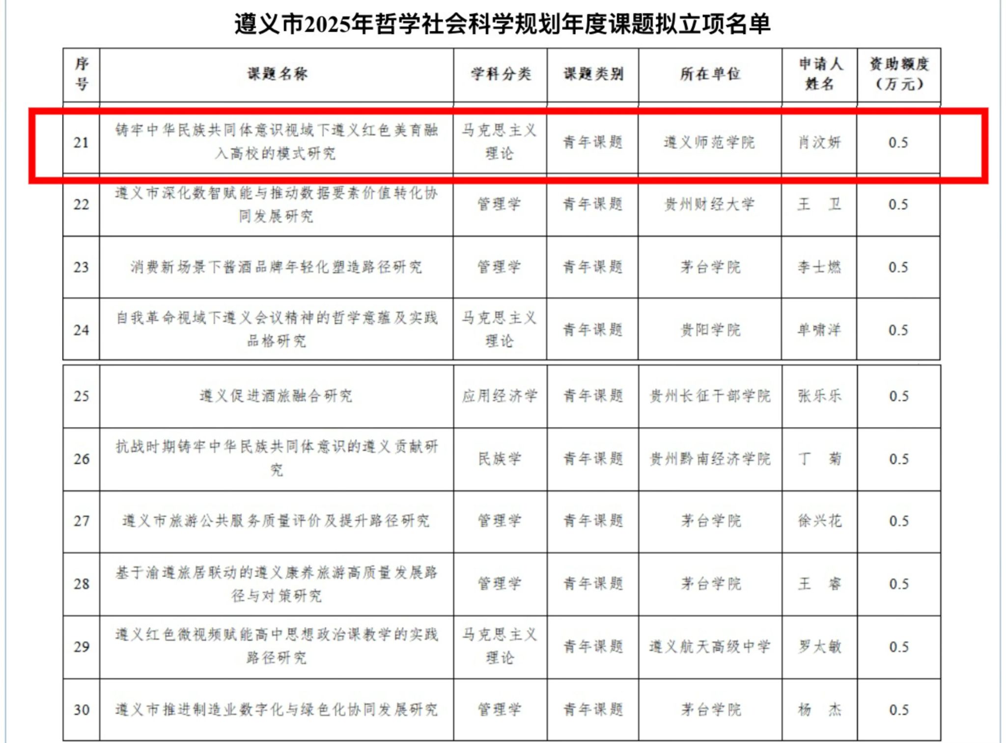 近日,遵义市哲学社会科学规划办公室公布2025年哲学社会科学规划年度课题立项结果。我院青年教师肖汶妍主持申报的《铸牢中华民族共同体意识视域下遵义红色美育融入高校的模式研究》成功获批青年项目立项。