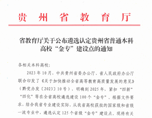 “金专”建设是贵州省推动高等教育高质量发展、紧密对接“四新”“四化”等重大战略的关键举措。本次遴选以全省已有的418个国家级和省级一流专业建设点为基础,最终认定125个建设点,竞争激烈,入选专业均代表了省内相关领域的最高水平。
