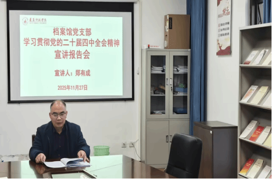 11月27日上午,学习贯彻党的二十届四中全会精神宣讲报告会在档案馆806会议室举行,党支部书记郑有成作宣讲报告,全体党员听取了报告。