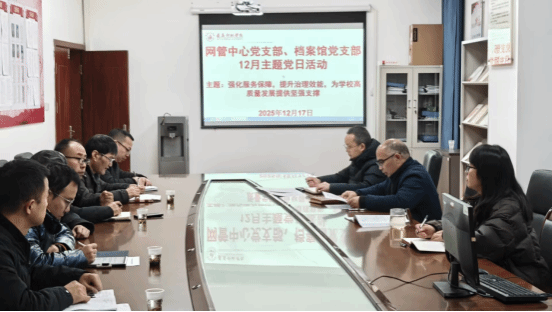 12月17日,档案馆党支部与网管中心党支部在图书馆楼806会议室,联合开展了以“强化服务保障,提升治理效能,为学校高质量发展提供坚强支撑”为主题的党日活动。两个支部全体党员参会,活动由网管中心党支部书记刘彦宾主持。