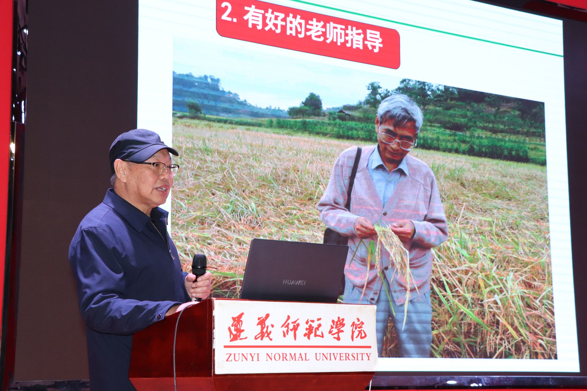 黄宗洪汇报稻作科研成果。他指出稻作对保障粮食安全、传承中华文明具有重要意义,强调团队协作与榜样力量的作用,并寄语青年学子夯实科学基础,为国家建设助力,彰显了贵州稻作科研工作者守护粮食安全的责任担当。