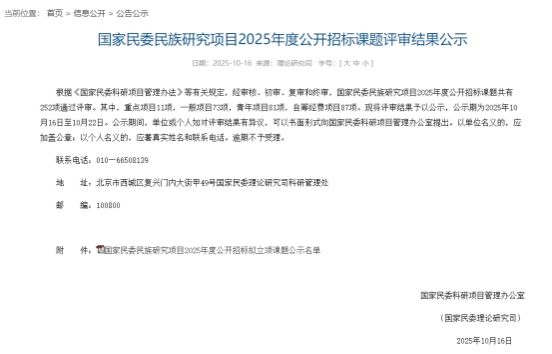 近日,国家民委网站发布了2025年度公开招标课题共有252项通过评审。其中,重点项目11项,一般项目73项,青年项目81项,自筹经费项目87项。我院阳序言博士获得青年项目立项。
