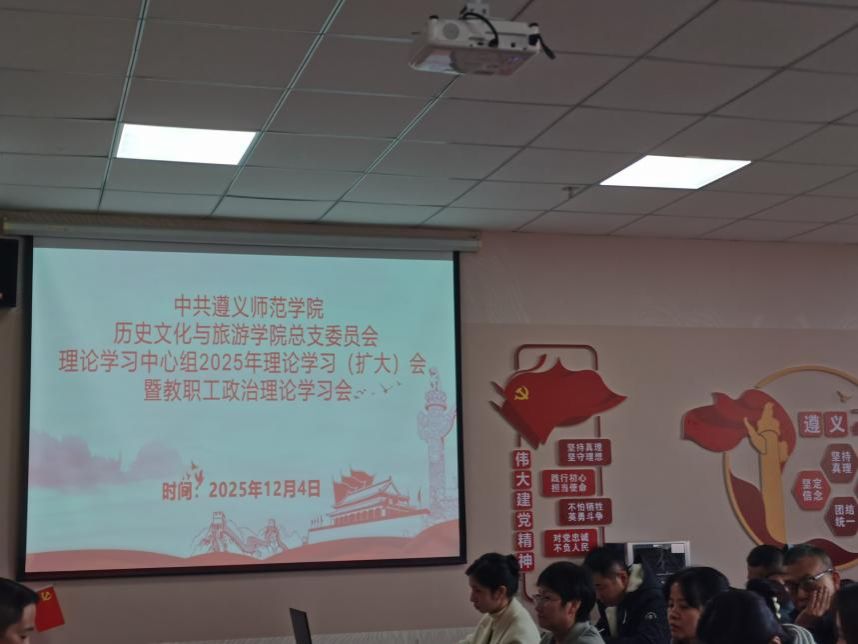 2025年12月4日14:00,历史文化与旅游学院党总支理论学习中心组在执文楼323会议室召开了2025年第十四次理论学习(扩大)会议暨教职工第十三次政治理论学习会议,本次会议由院长郗玉松主持,参会人员为全院教职工。