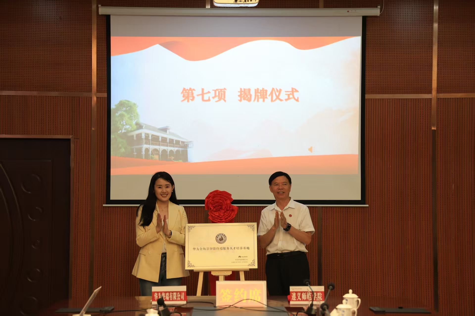 本网讯(文/施宣 图/周选州) 9月29日上午,遵义师范学院学术交流中心一号会议室气氛热烈,学校与华为终端有限公司“全场景智能终端服务人才培养项目”签约及揭牌仪式举行。此次合作标志着双方在深化产教融合、共育数字经济人才方面迈出关键一步,也为高等教育与企业需求精准对接开辟了新路径。
